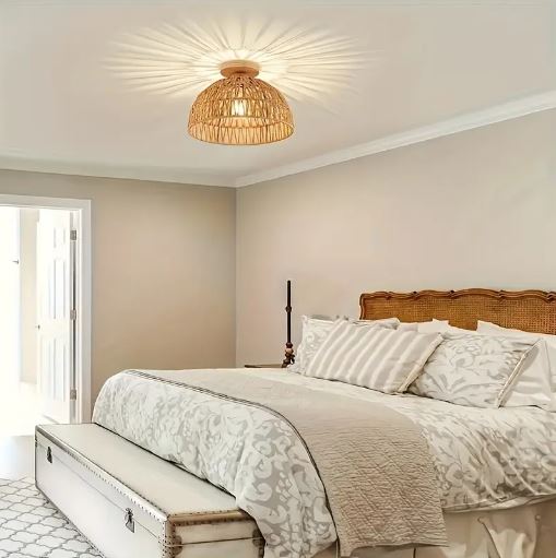 - Made of 100% hand-woven rattan onto a sturdy metal frame, natural wooden base completes the ceiling mount light with rattan design matches craftsmanship, adds a touch of coastal to your bedroom.