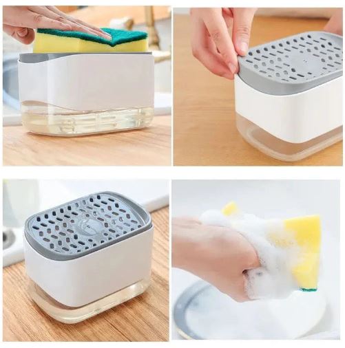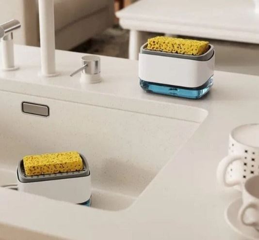 - This 2 in 1 liquid soap dispenser comes with a convenient sponge caddy holder, making it the perfect addition to any kitchen.