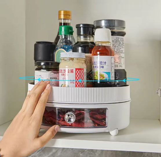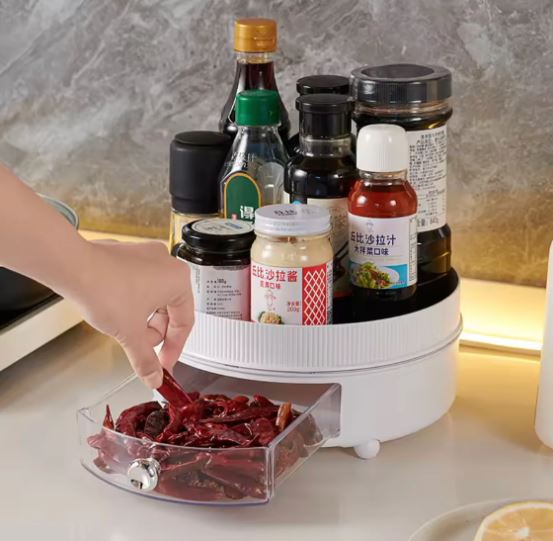- Add style and convenience to your space with this 360° rotation spice rack, a large-capacity storage tray perfect for organizing kitchen seasonings or cosmetics.