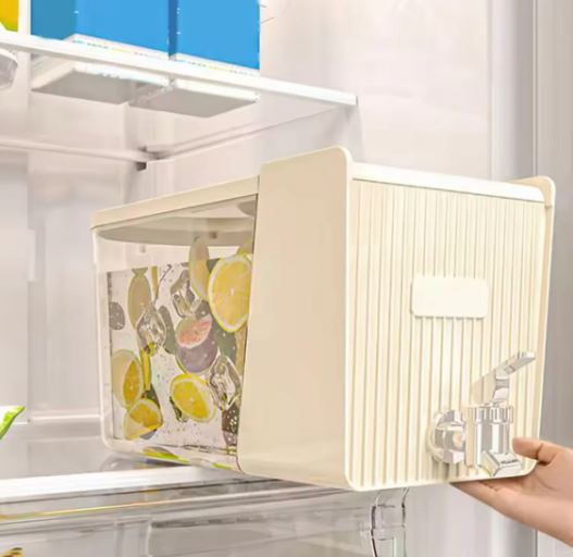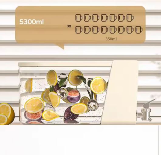 - This 5.3L refrigerator drink dispenser is a large-capacity beverage container designed for easy storage and dispensing in your refrigerator.