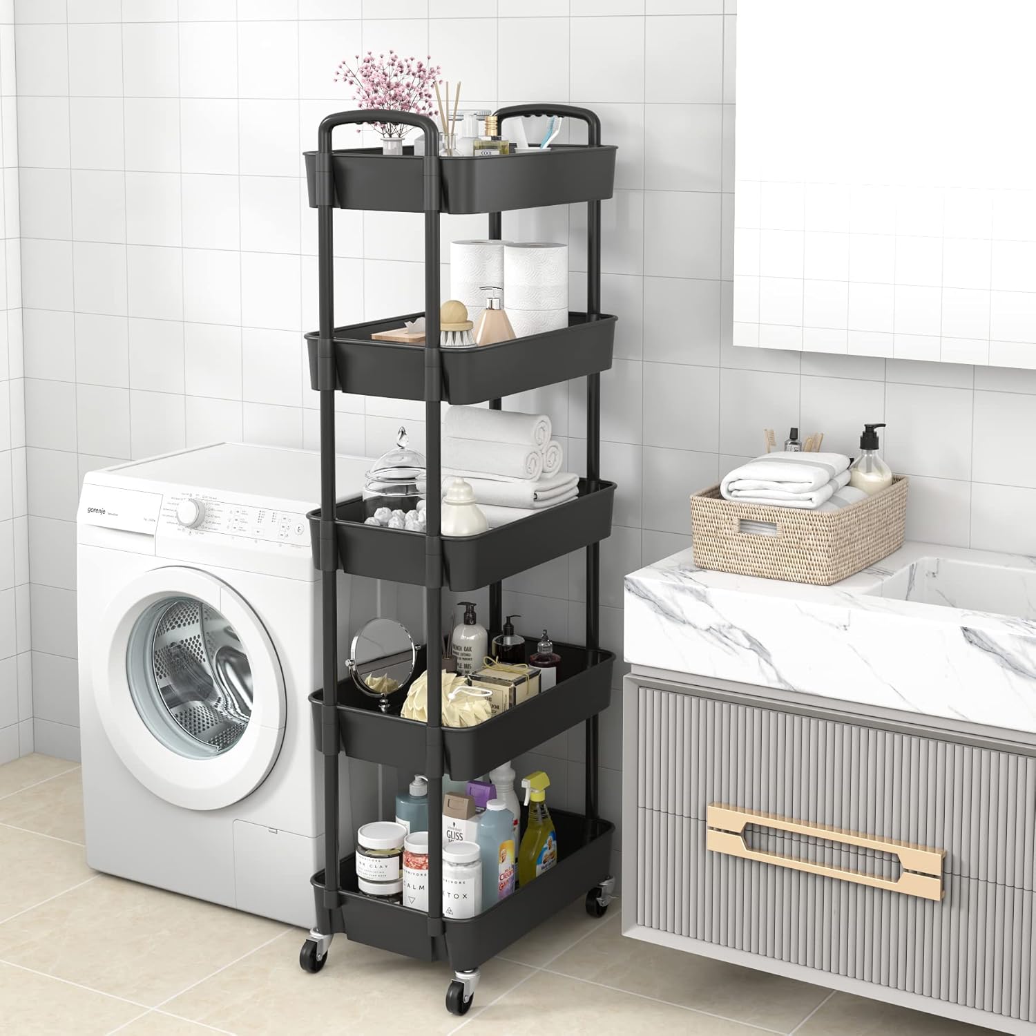5-Tier Plastic Rolling Utility Cart with Handle, Multi-Functional Storage Trolley for Office, Living Room, Kitchen