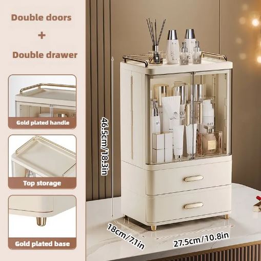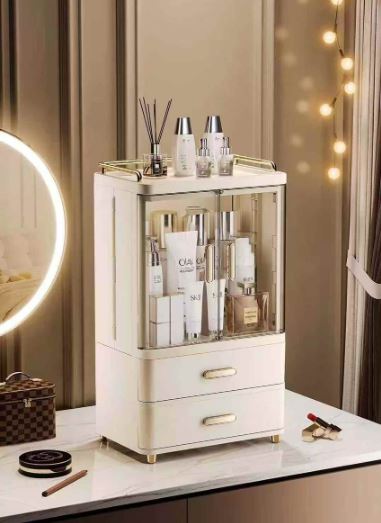 - The top section is enclosed by transparent doors, perfect for displaying and organizing skincare products, perfumes, or larger cosmetic bottles in a dust-free environment.