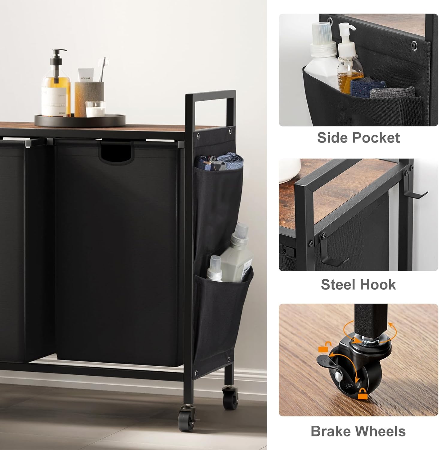 Double Laundry Hamper with Lid, Laundry Sorter with Top Shelf and 2 Removable Bags, Large Laundry Storage for Room, Black