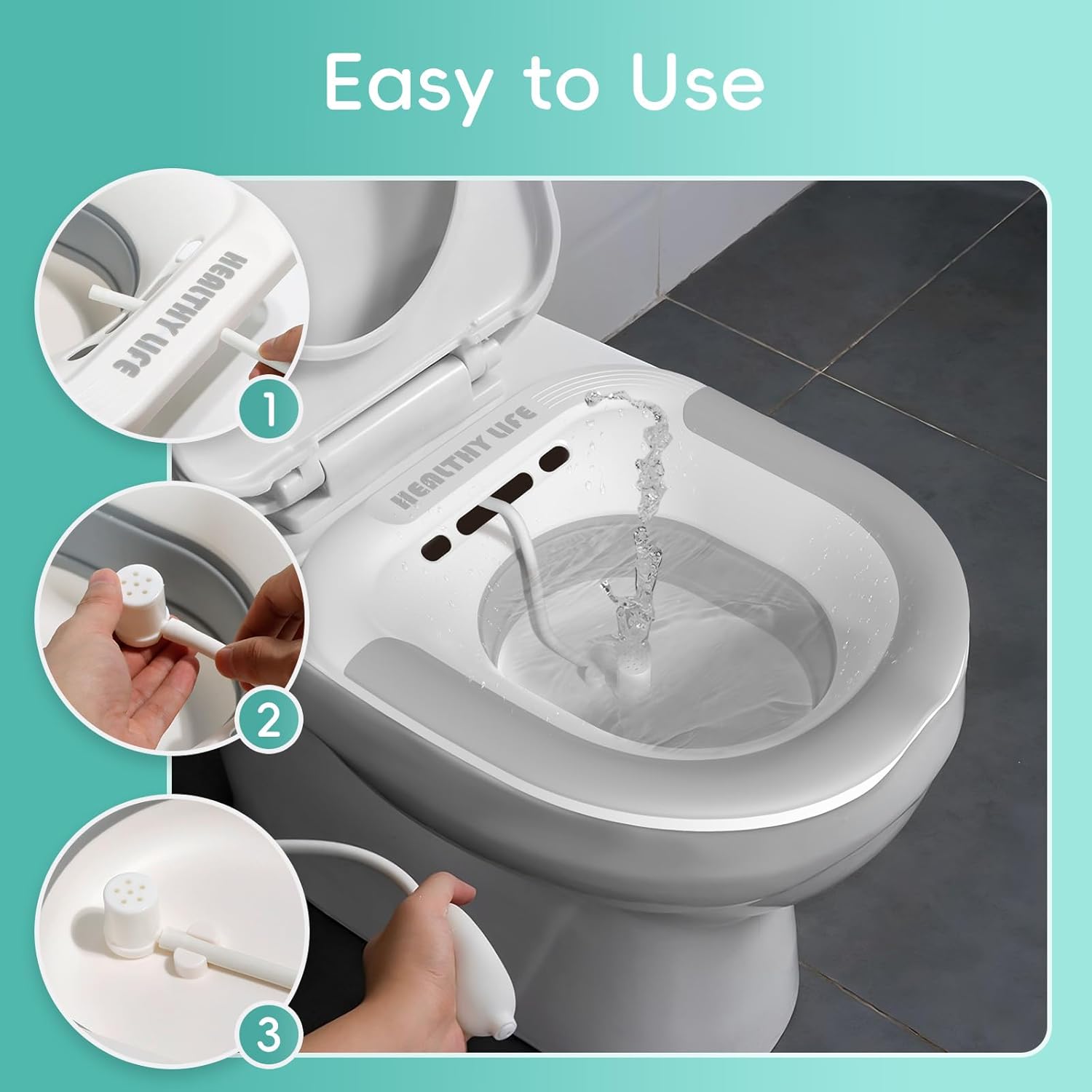 - [EASY TO USE]: No need for a bathtub, this hemorrhoid sitz bath for toilet can perfectly cover your toilet teat, suitable for 99% of the Standard toilet lid, like square, round. Just clip the nozzle hose in your desired position and gently squeeze the bulb to spray a soft, steady stream of water. The sitz bath for women is ideal for post-natal care and personal daily cleaning.