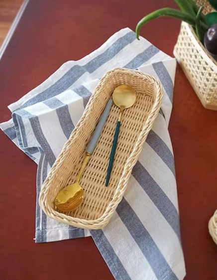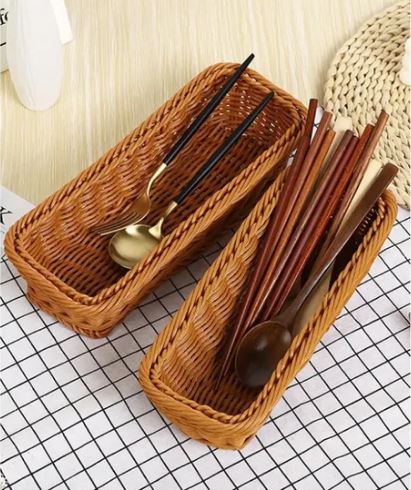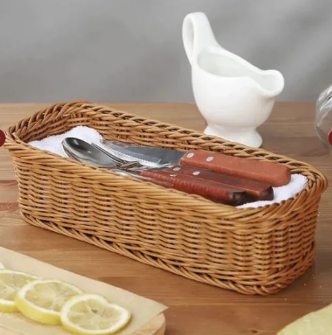 - The refreshing design and subtle texture of the ratan basket adds a beautifully rustic charm to holding, showcasing and serving cutlery, an eye-catching great decor for your dining or coffee tables.