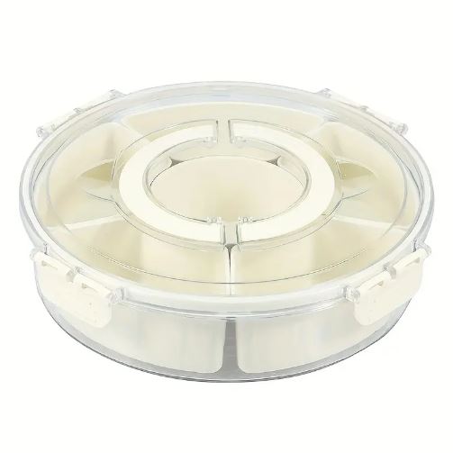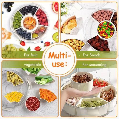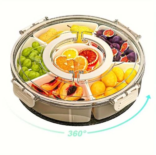 Rotating Snack Organizer Tray with Lid and Handle, Large Multi-Compartment Plastic Food Platter, Portable Snack Tray