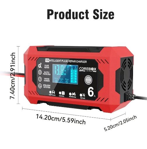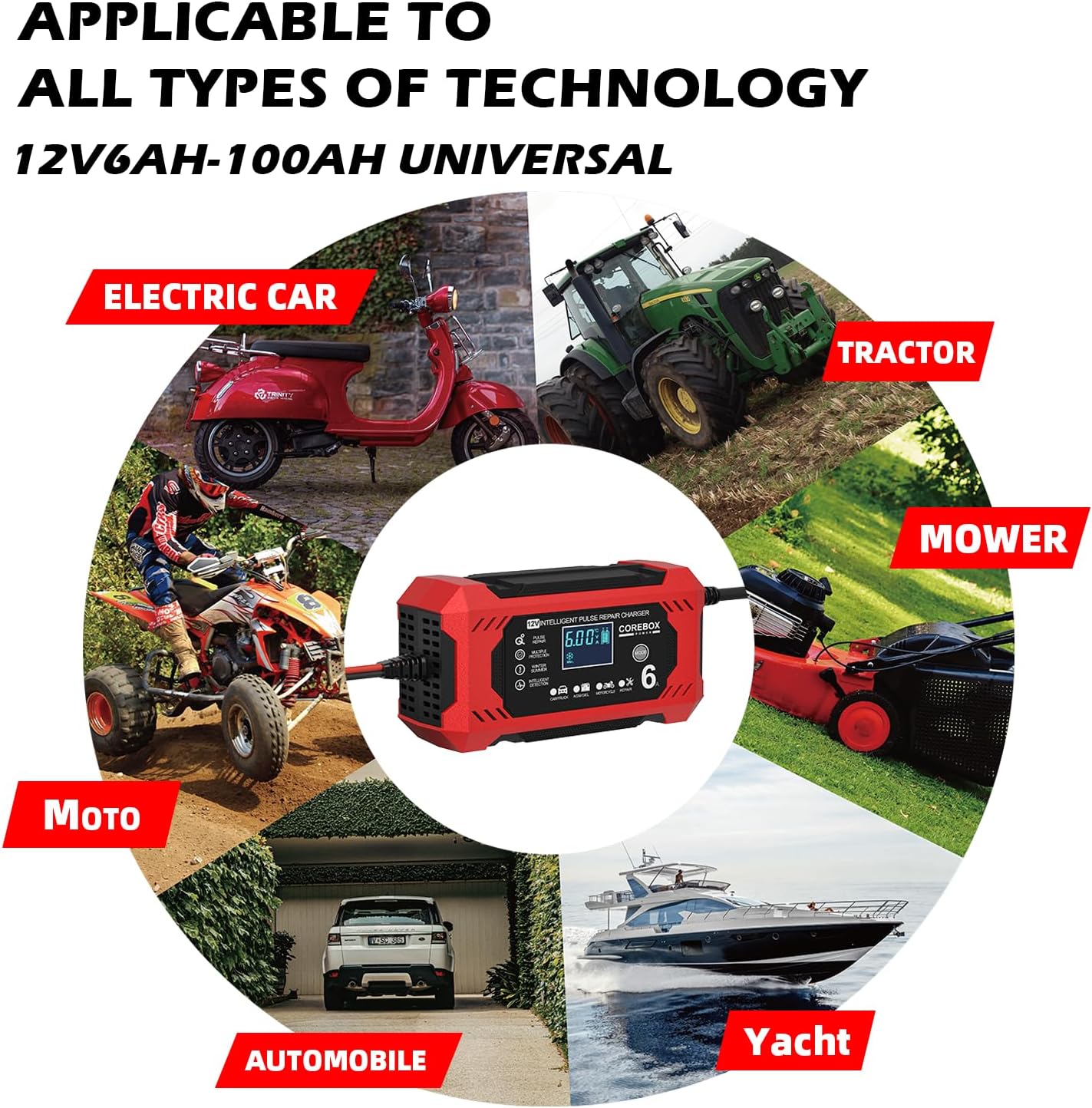 Smart Battery Charger 12V 6A with LCD Display - Versatile Lead-Acid Trickle Charger for Cars, Trucks, Motorcycles, Lawn Mowers, and Marine Vehicles