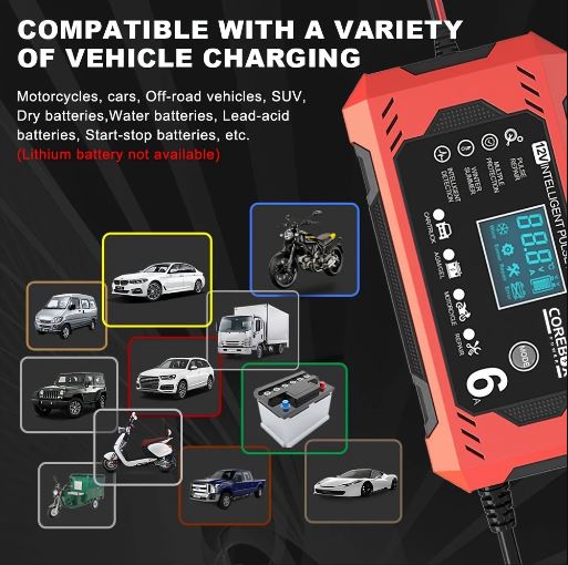 - Suitable for charging and repairing all 12V lead-acid batteries, including AGM, GEL, SLA, and Flooded types, in cars, trucks, SUVs, motorcycles, lawnmowers, boats, and more.