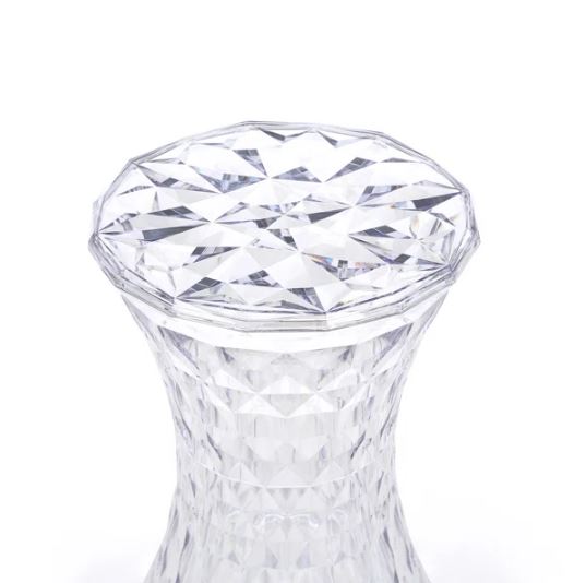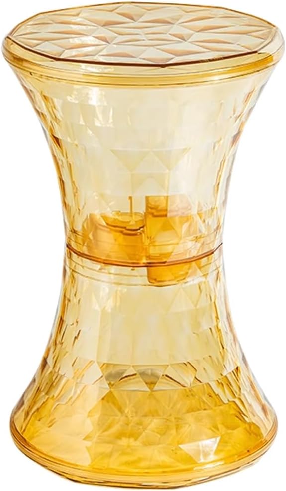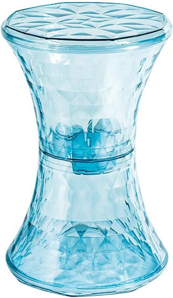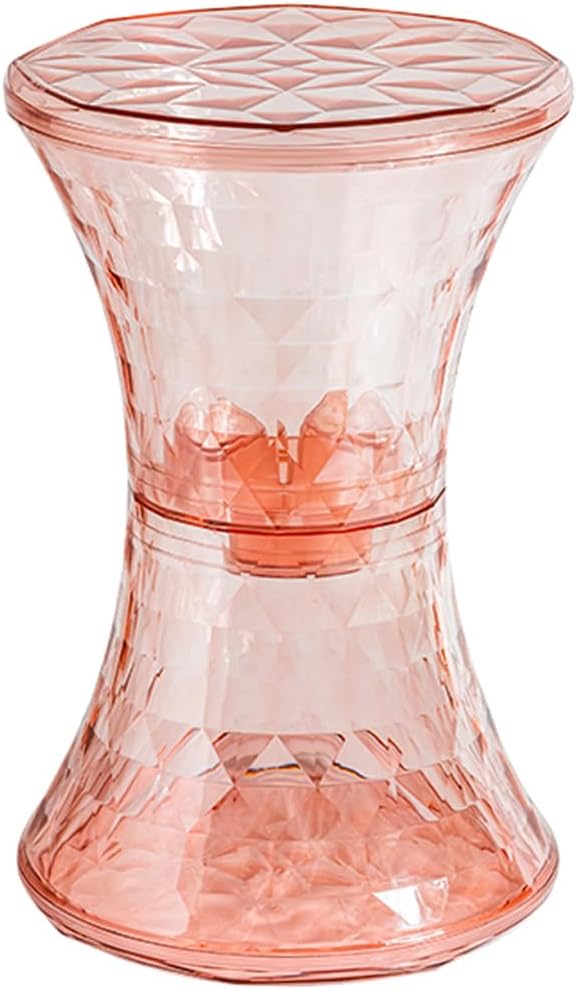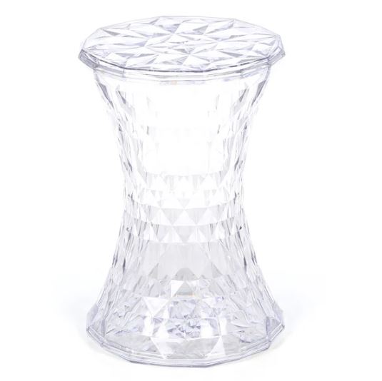 - Our transparent storage stool features an hourglass shape with a geometric cut interior that resembles a diamond and sparkles from different angles.